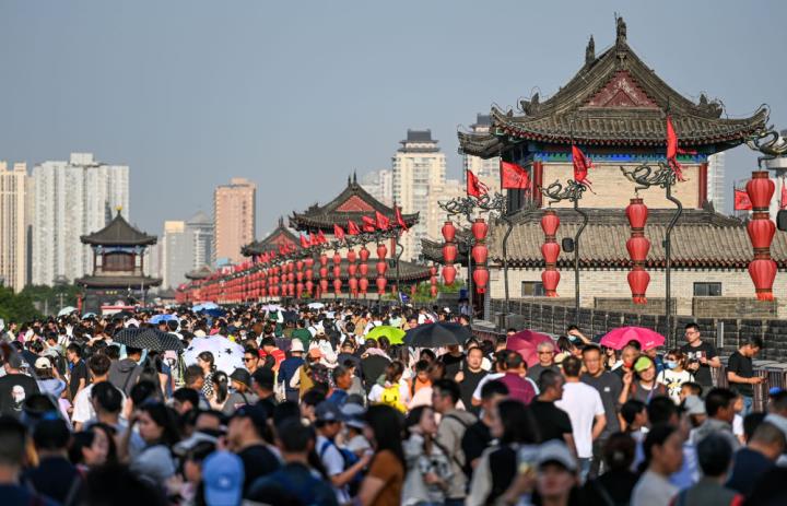 Since the beginning of this year, the domestic cultural tourism market has been booming. The picture shows tourists visiting the Xi’ an City Wall Scenic Area. Source: Xinhua News Agency